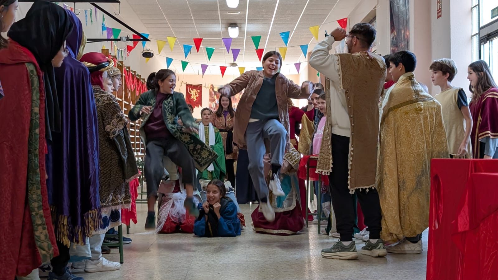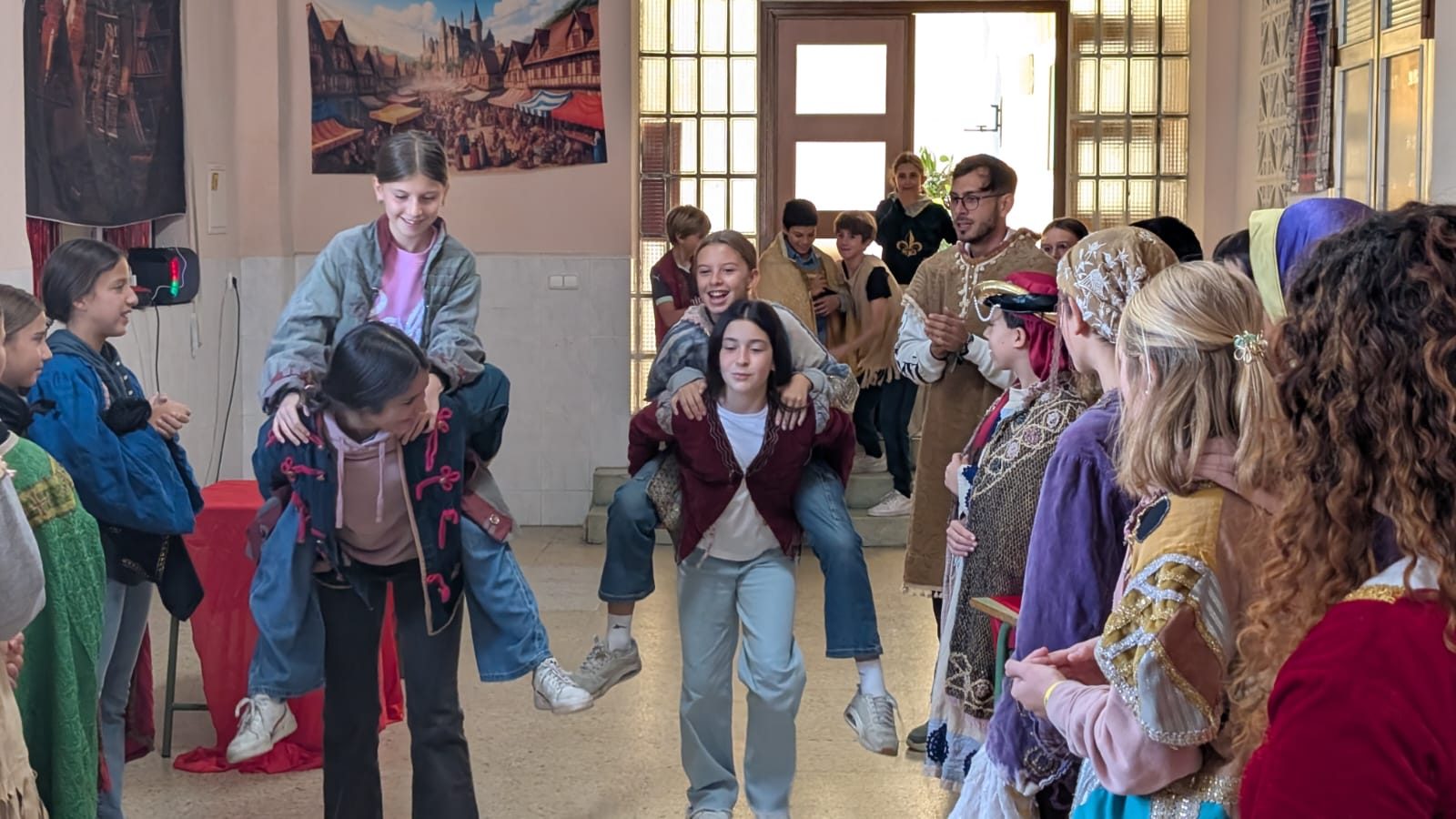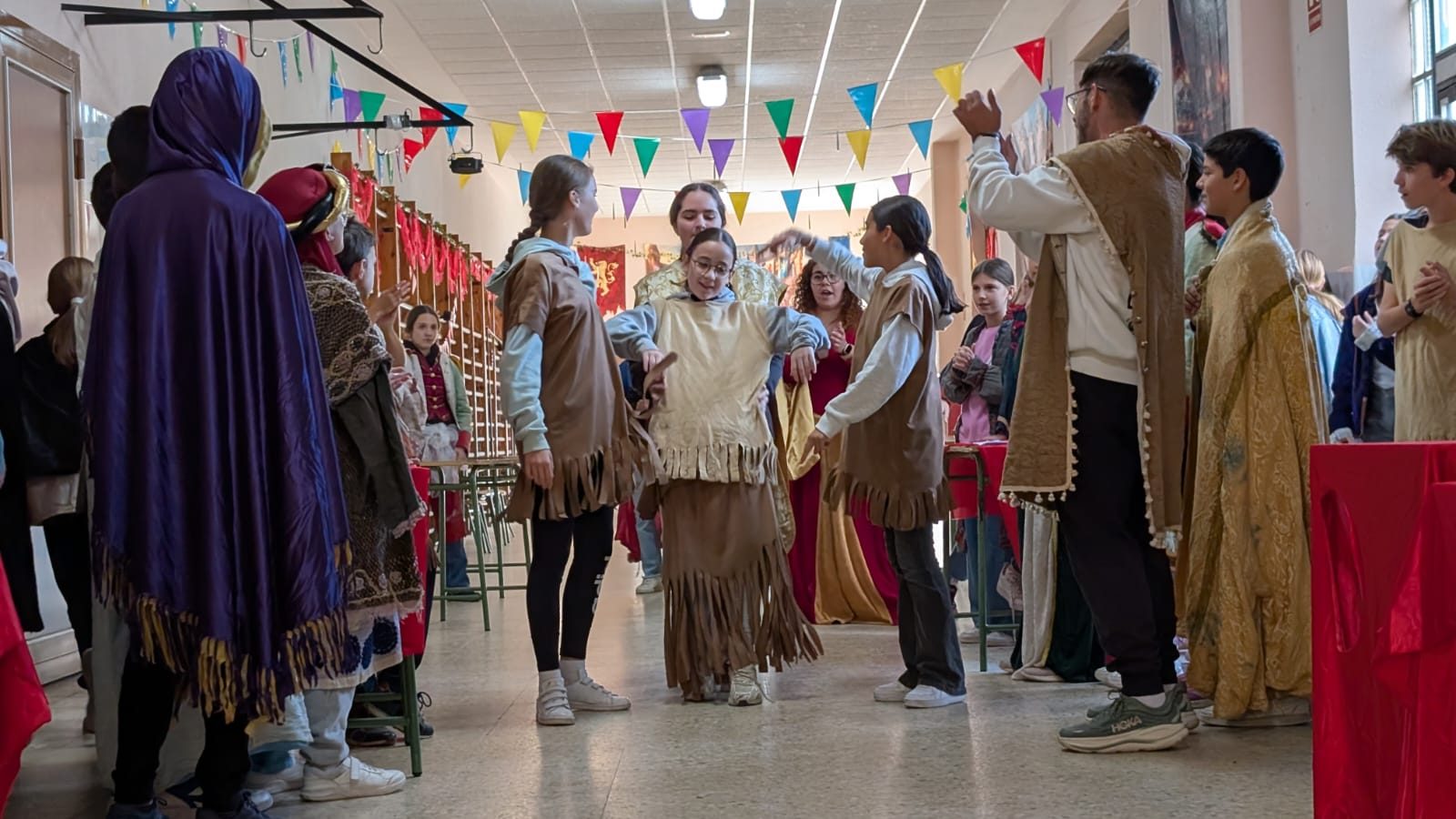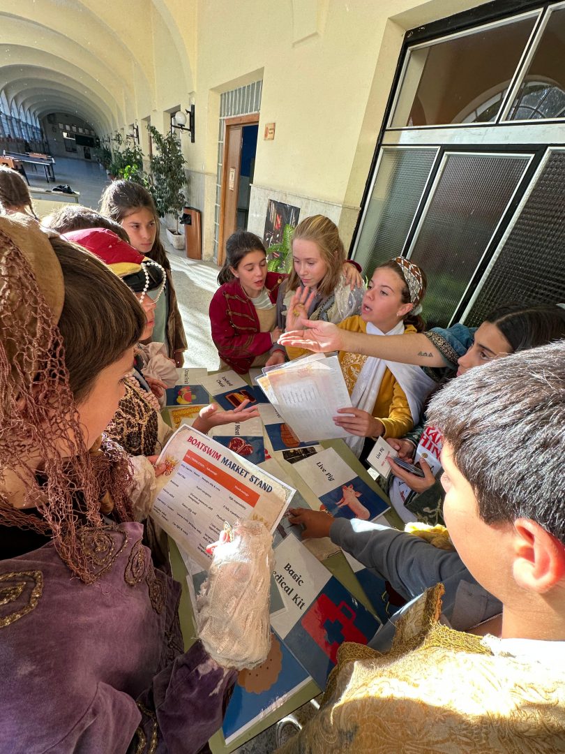 Comimos guiso de carne y albóndigas, y por la tarde, vendieron los productos que habían creado al resto de las culturas. El mercado es una actividad muy rica en la que, además, los jóvenes deben redactar en inglés y presentar ante los demás la civilización que han escogido, para así conocer más de cerca aquellas sociedades. Y para terminar la tarde, salimos a celebrar nuestra Spartan race, una carrera con multitud de pruebas físicas.